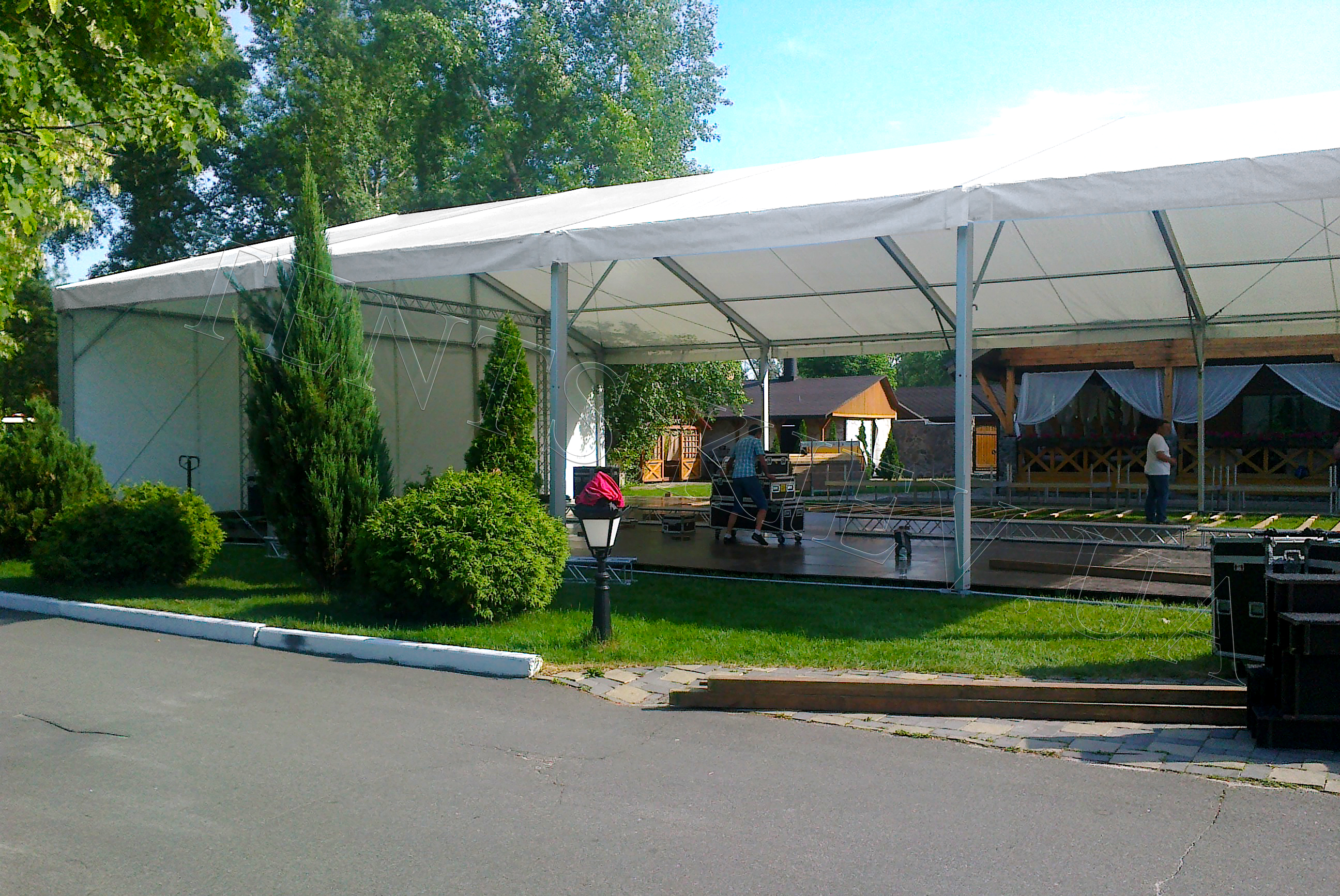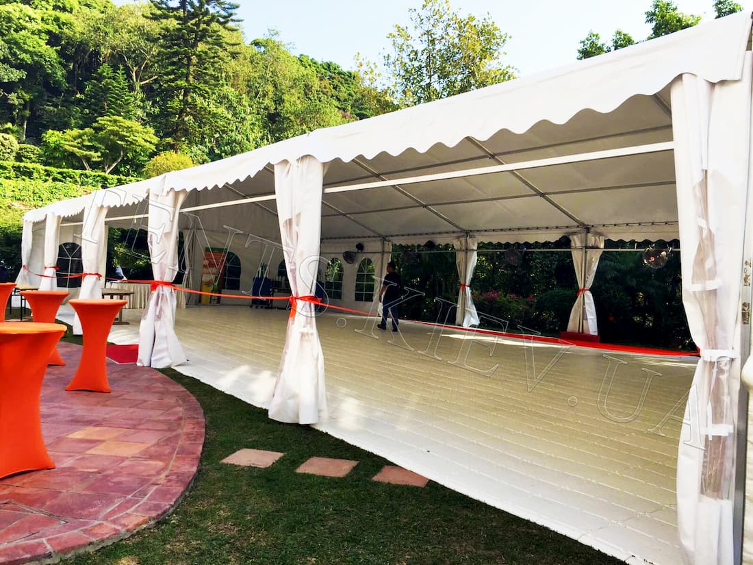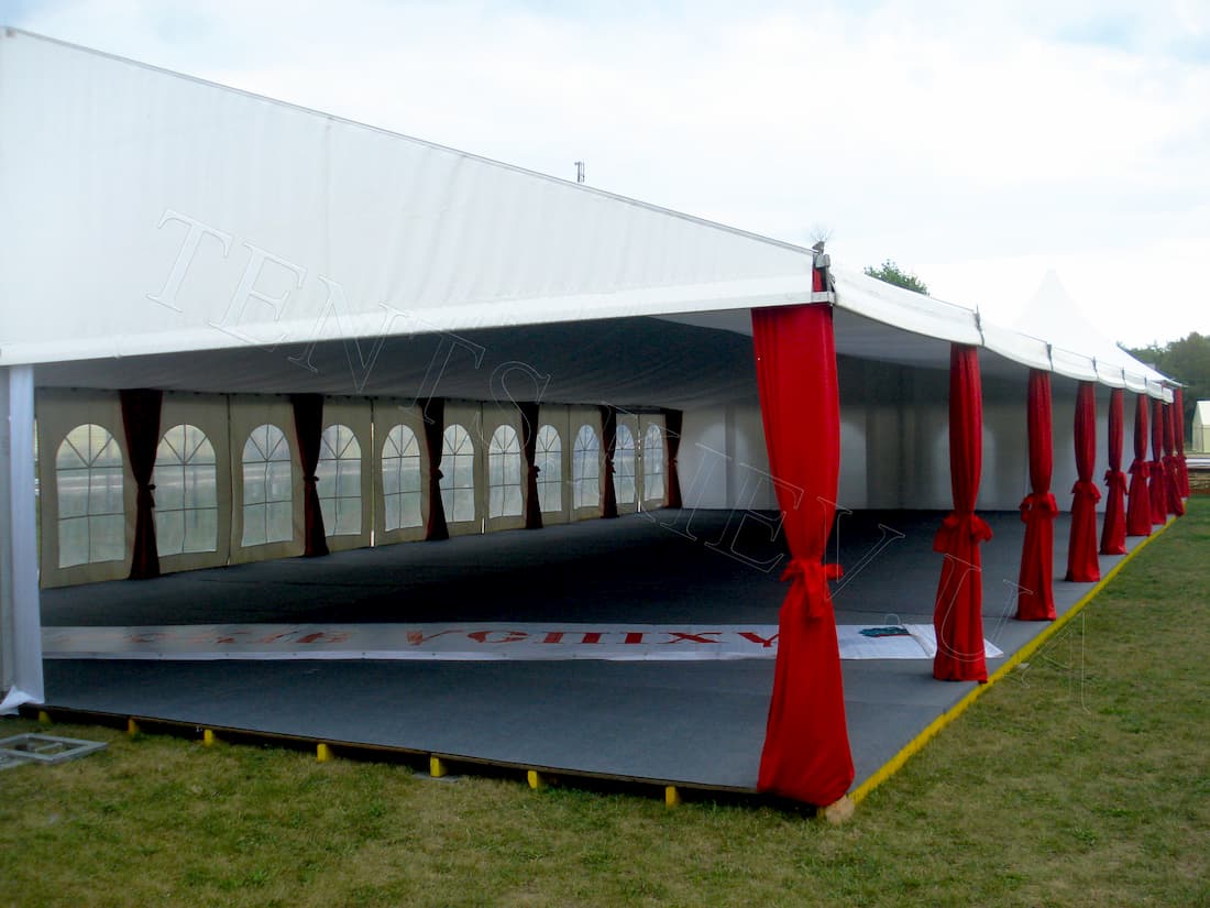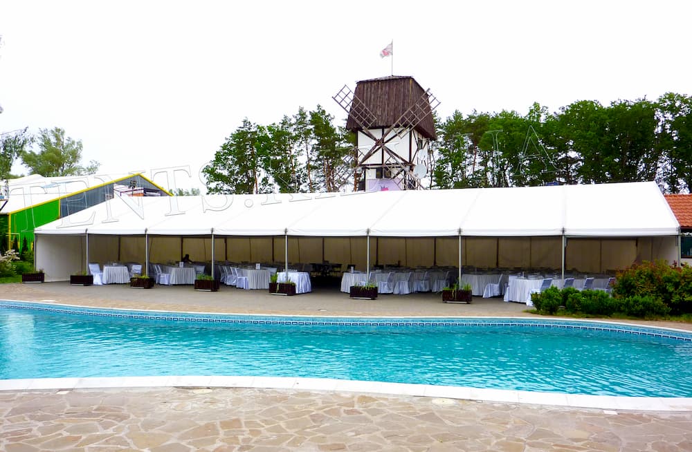Алюмінієві модульні споруди Мультифлекс — це повнокаркасні конструкції з двосхилим вініловим дахом і розсувними знімними стінками білого кольору. Комплектуются из блоков 10х3м.